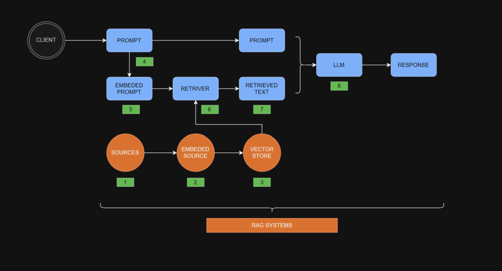 - Retrieve Relevant Data: Pass the prompt embedding to the retriever. The retriever also accesses the vector store to find and pull relevant source embeddings (vectors) that match the prompt embedding. The retriever’s output is the retrieved text.